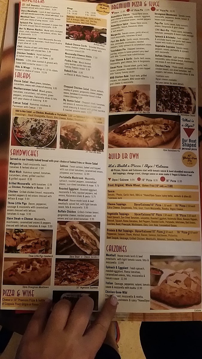 *HomeSlyce sauce goat and mozzarella cheese, walnuts, eggplant, spinach, caramelized onions, roasted peppers